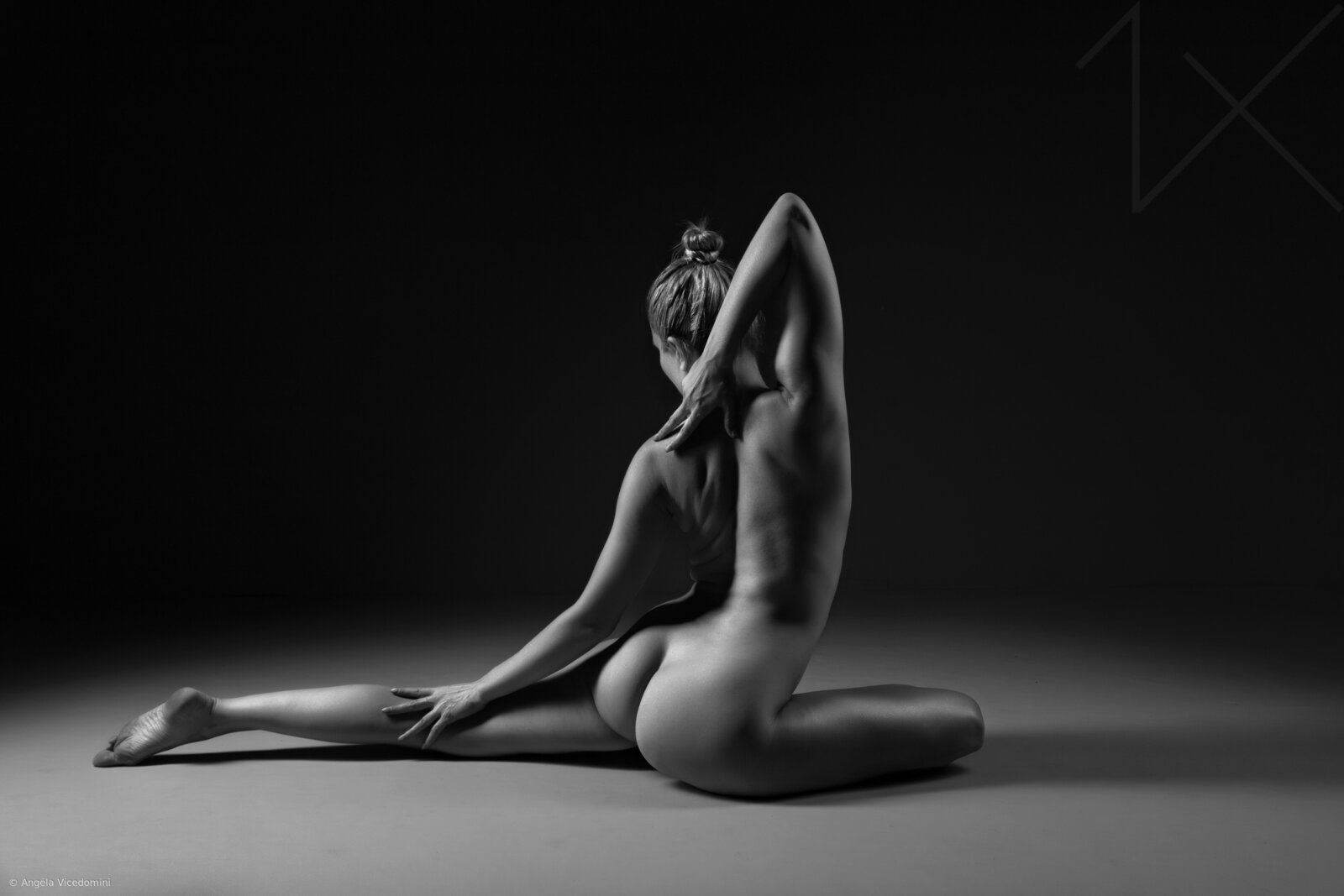 Angéla Vicedomini frequently places her models at the exact center of the frame, surrounded by negative space that reinforces their physical presence. There is little environmental context to soften the image or suggest a narrative. Both floors and backgrounds fade into darkness or neutrality, leaving the body isolated.