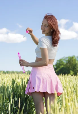 Fiery redhead, Cherry Candle, poses in pink shorts and a white top that barely leaves anything to the imagination. With green grass and a pool in the backdrop, this In The Crack gallery gives off summer vibes that only get hotter as this sexy babe begins to remove her clothes.